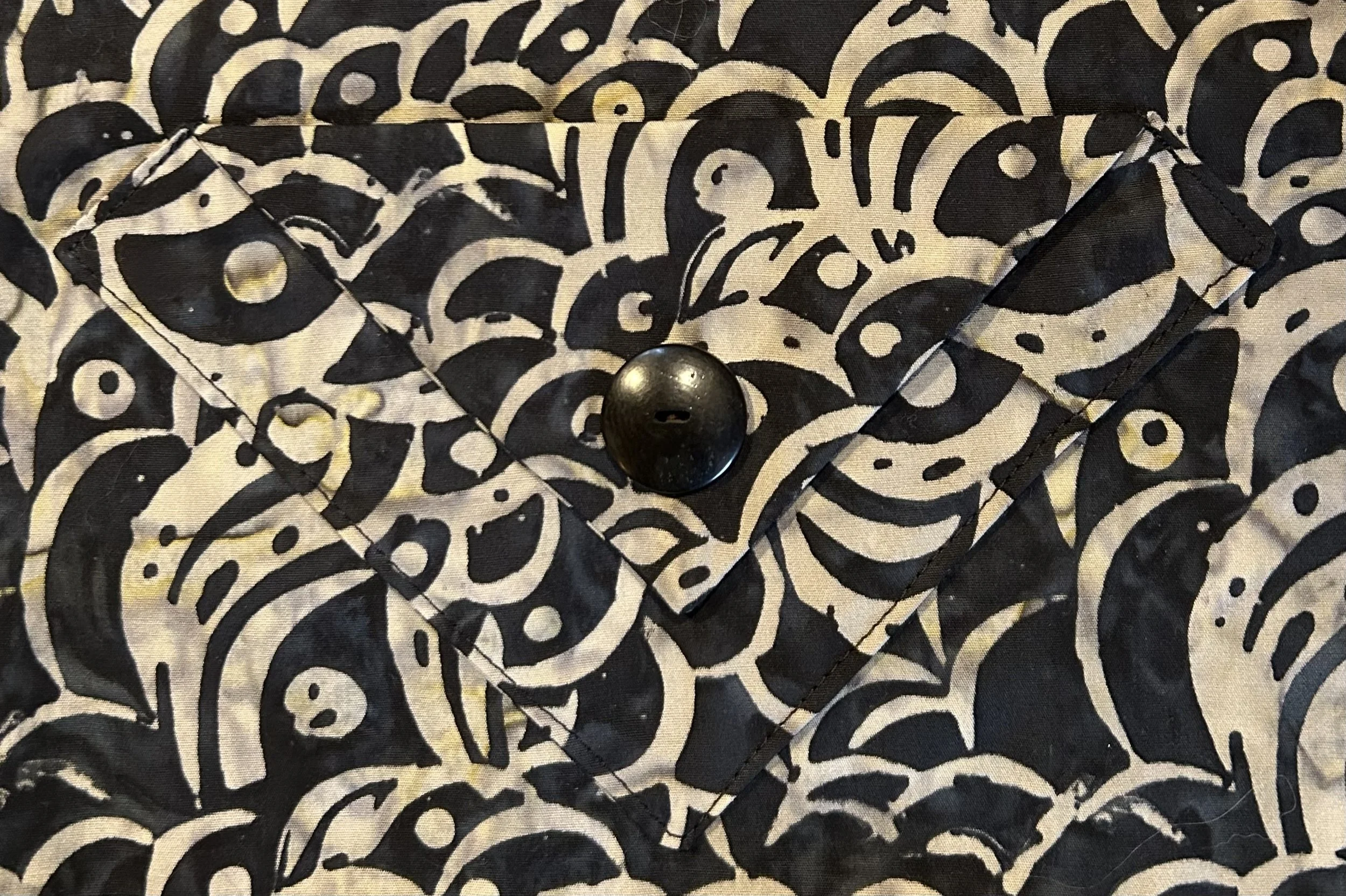 Take a square pocket, turn it on its side, fold over one corner while anchoring it with a vintage button and you have a pocket with style. Its double layer gives it body and shape.